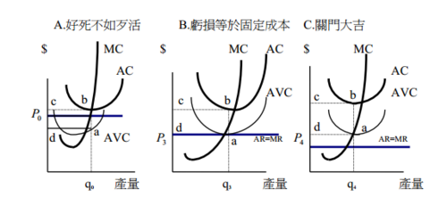 短期中,厂商若亏损,是否应马上停业,决定于亏损是否超过总固定成本,只要亏损小于总固定成本,继续生产比停业有利。A、B、C三个图的阴影面积分别代表不同价格下的亏损,而对应的abcd都代表总固定成本。A图的P0介于AC与 AVC之间,均衡产量q0下之亏损小于总固定成本,故以生产为宜。B图的 P3刚好是 AVC最低点,均衡生产q3下的亏损等于总固定成本,顾生产与停业没有差别。图的 P4低于AVC,生产q4的亏损大于总固定成本,停业是较好的选择。