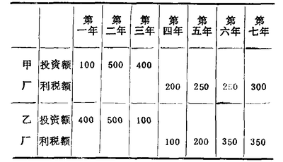 从表中资料可看出,甲乙两厂3年建厂期间的全部投资额均为1000万元,两厂投产后4年期间提供的利税额均为1000万元。用静态评价法得出的结论是:两厂投资回收年限均为4年。