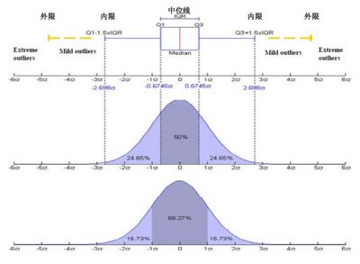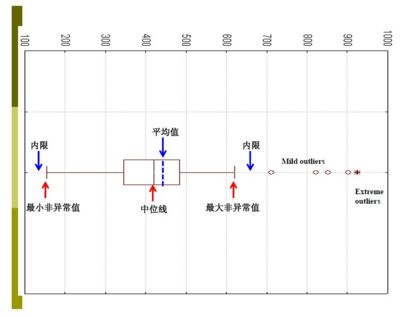 (3)在Q3+1.5IQR(四分位距)和Q1-1.5IQR处画两条与中位线一样的线段,这两条线段为异常值截断点,称其为内限;在Q3+3IQR和Q1-3IQR处画两条线段,称其为外限。处于内限以外位置的点表示的数据都是异常值,其中在内限与外限之间的异常值为温和的异常值(mild outliers),在外限以外的为极端的异常值(li)的异常值extreme outliers。