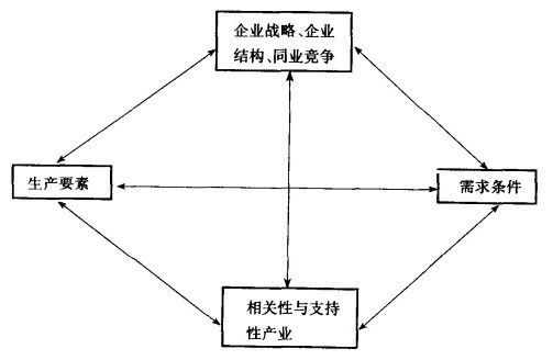 (3)1990年,波特又从产业的角度提出了国家竞争优势理论,认为生产要素、需求状况、相关产业、企业组织与战略这4个关键要素共同决定了产业竞争优势,如右图所示。其中,生产要素主要包括诸如自然资源、劳动力、地理位置、气候条件等基本要素和现代化的通信网络、高精尖科技人才和领先学科等后天开发的推进要素;需求情况指国内需求与国际需求状况比较而言的相对优势(或劣势),是企业的生产方式、组织形式、营销经验等因素赖以形成的基础,决定了企业是否具有先行者优势、内部规模经济性或外部规模经济性等竞争优势;相关产业指上游产业、下游产业、辅助产业之间彼此紧密合作、互相促进的关系;企业组织与战略指有利于企业获得竞争优势的战略和与其匹配的组织形式。