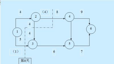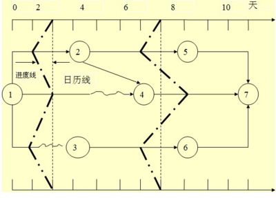 当采用非时标网络计划时,可直接在图上用文字或符号记录。如用点划线代表其实际进度并在网络图中标出,如图9-4所示。
