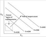 进而利用最陡上升(下降)法。所配适一阶模型的反应曲面,也就是 的等高线,沿着最大反应变量增加(减少)逐次移动程序,直到反应值无法再改善为止,其中,前进步伐的决定并非固定不变,可以根据实验情况或经验值决定,接着以此组操作水平为新的实验中心点,并重复实验步骤,往最佳反应曲面的方向逼近,并且执行线性模式之缺适性检定,一旦发现一阶回归模型不适合时,表示已接近最佳点,此时应采用更复杂的数学模式来进行分析。 |