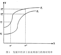 图1中,F1为工业部门的产出,FA为农业部门的产出。图中,F1与FA这两条曲线的形状近似,前者始终在后者的上方,但随着投入规模的不断增大,两者之间的距离却在不断缩短,这是因为F1的截距比FA的截距高,但FA的斜率却比F1的斜率大,但总起来的结果,是F1有比FA高的综合效率。这意味着,总起来讲,工业部门比农业部门的效率高,主要在于部门平均技术水平的差距,即简称的技术差距,而在规模效率上,农业却比工业高些。这在发展中经济里也很常见。