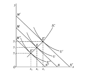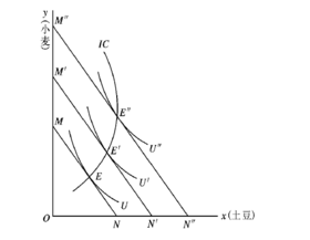 在图3中,横轴表示商品x(如土豆)的购买量,纵轴表示商品y(如小麦)的购买量。MN,M'N'和M"N"分别是收入为I,I'和I"时的预算约束线,它们分别与无差异曲线U,U'和U"相切于E,E'和E"点。把E,E',E"……相连接起来的曲线就是收入-消费曲线。当收入水平相对低的时候,x和y商品都是正常商品。但当收入上升时,收入-消费曲线便向左上方弯曲(如图中E"点以上的部分)。这是因为x商品已经成了一种劣质商品,当收入增加时,它的购买量反而下降了。