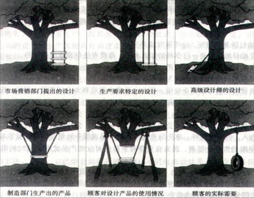 串行的产品开发过程存在着许多弊端。下图所示的幽默画导出了其弊端。首要的问题是以部门为基础的组织机构严重地妨碍了产品开发的速度和质量。产品设计人员在设计过程难以考虑到顾客的需求、制造工程、质量控制等约束因素,易造成设计和制造的脱节;所设计的产品可制造性、可装配性差,使产品的开发过程变成了没计、加工、试验、修改的多重循环,从而造成设计改动过大大,产品开发周期长,产品成本高。归纳起来,串行的产品开发过程存在的主要问题如下: