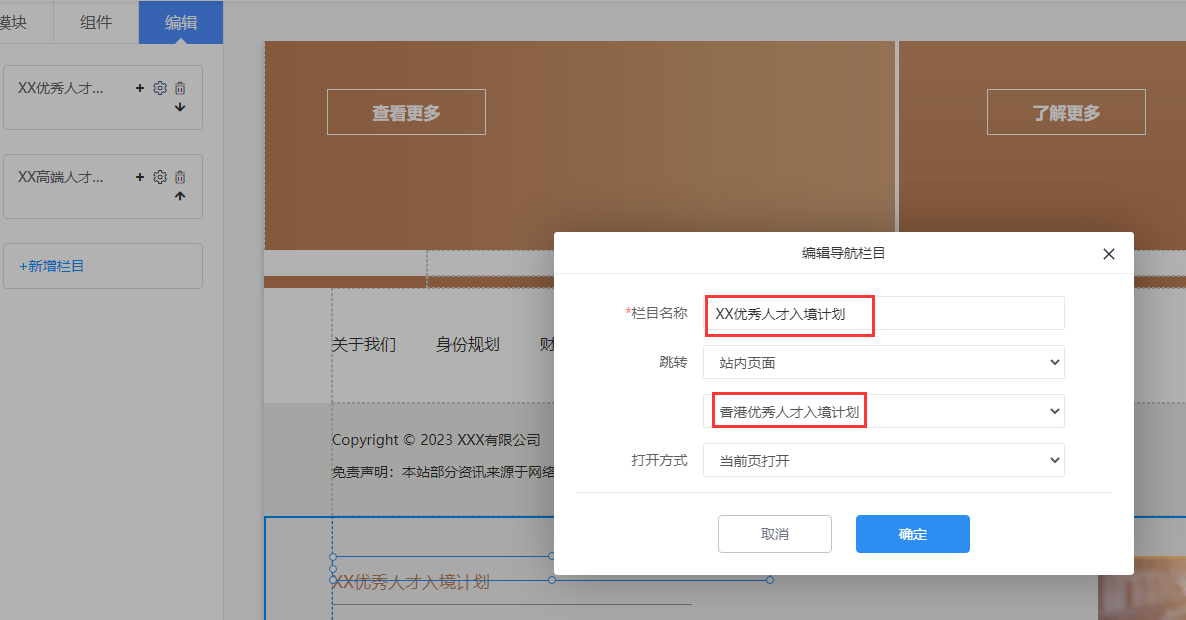 2、栏目名称可以根据需求修改,跳转对应页面也根据实际情况在下拉框中选择。