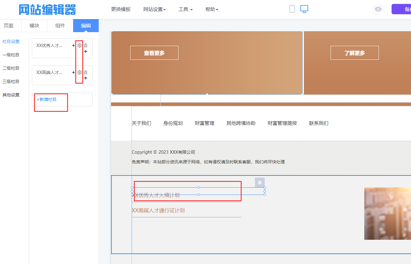 1、官微中心后台-网站装修进入网站编辑器界面,在PC端页面编辑中页面往下翻到底部可以找到导航对应的下拉二级导航模块,点击下二级导航对应的名称进入编辑。在左侧编辑栏点击栏目名称后方的“小齿轮”进入二级导航设置窗口。如果想增加栏目点击“新增栏目”进行新增。