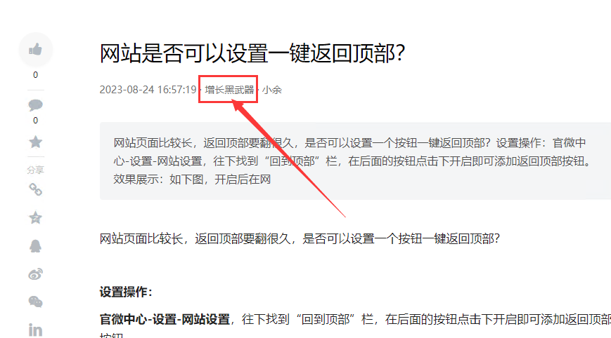 文章中显示的作者前面的名称是在哪修改的?如下图所示,作者“小余”前面部分的“增长黑武器”在哪修改?