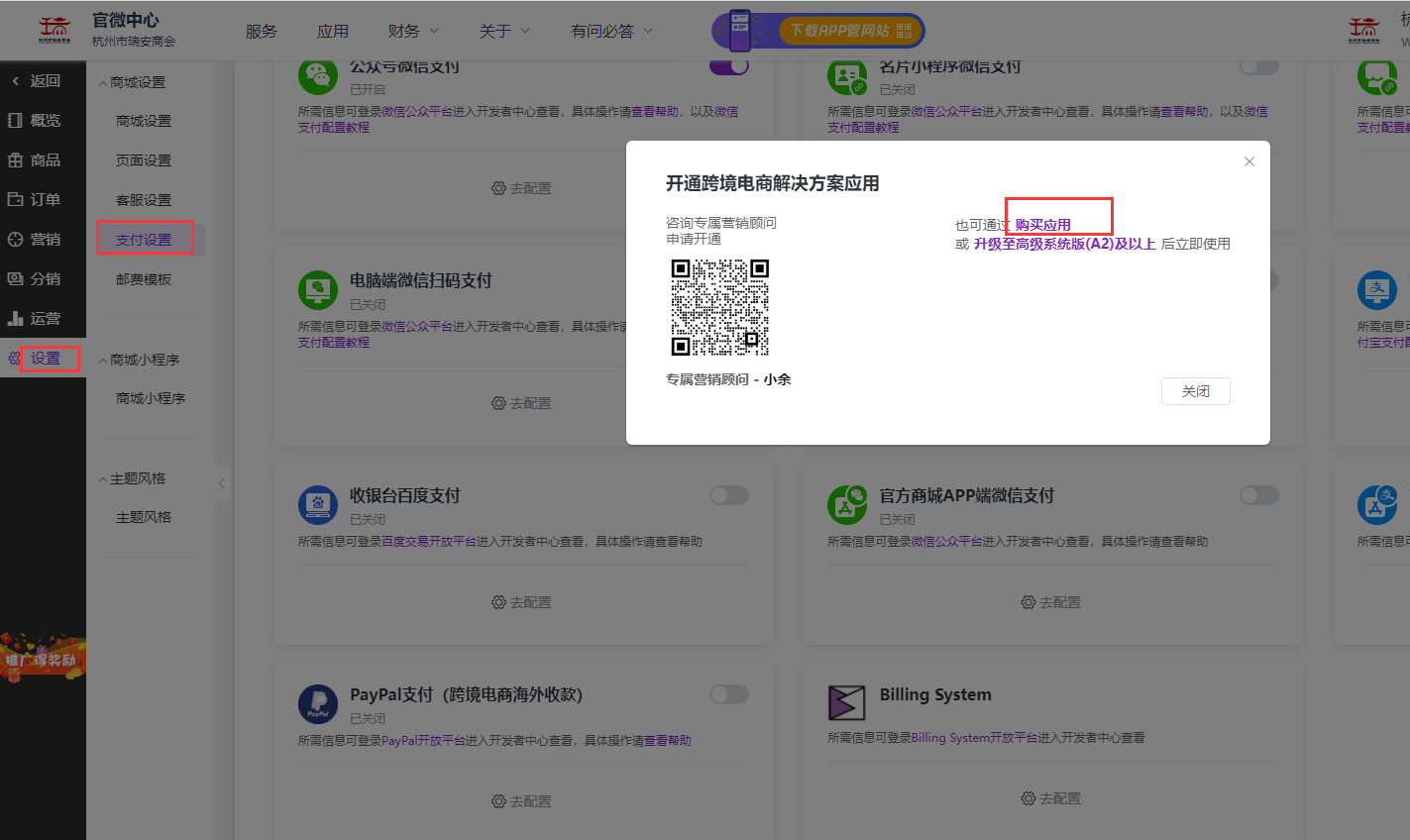 单独开通功能操作如下图所示,在商城-设置-支付设置中点击PayPal支付弹窗处点击“购买应用”。