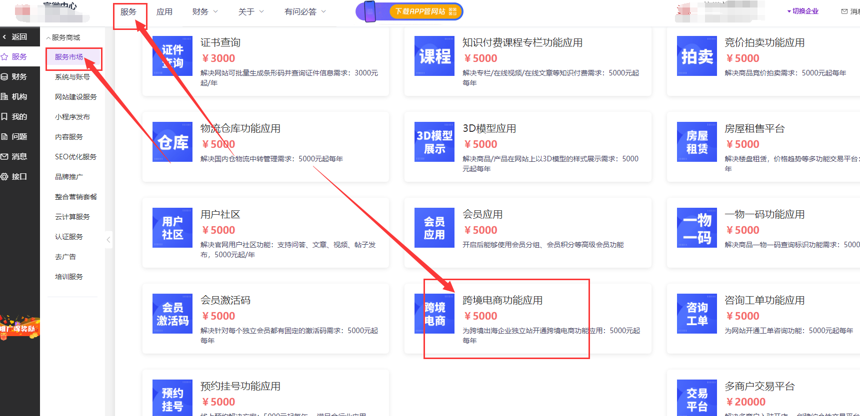 或者在官微中心后台-服务-服务市场中往下翻找到“跨境电商功能应用”,点击进入购买。