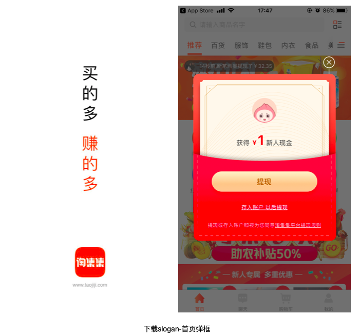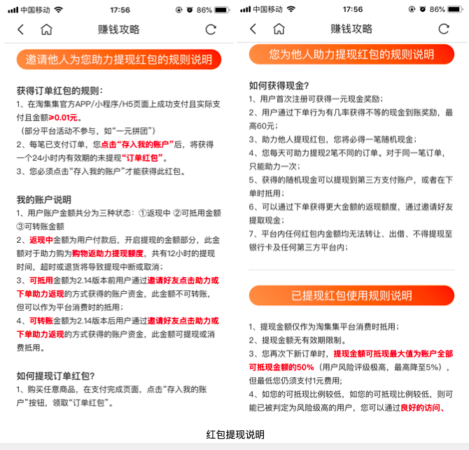 更引人注意的是,淘集集改进了领红包模式,加入了“提现”功能。这意味着用户的每一次有效分享,都可以获得实实在在的现金收益,实现人脉变现。具体表现为凡购买商品后获得的红包,在分享给好友助力后都可提现。值得注意的关键是,好友助力成功后,都可以获得可提现的现金,而不是购物券,使得购物者的分享欲望大大提升。尽管提现功能按钮在平台的三级页面内,入口并不明显,但是上线第一天就有21万的用户触发了提现需求。这样,淘集集变相解决了招募新用户和推动活跃用户的问题。