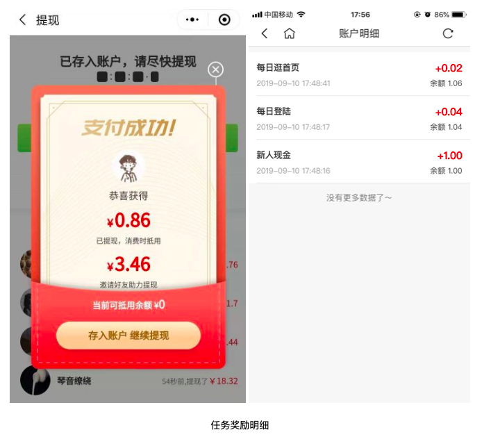 又会提示用户还差一定金额可提现,又会再次激励用户继续分享。页面左上方还会滚动提示,有用户提现了一定金额,不断激励用户:这个目标是可以实现的,提现是绝对真实的,以激励用户积极分享。