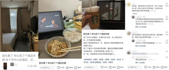 小红书爆文标题:标题使用情绪词+解决方案的形式,以疲惫和休假作为关键词,引发读者共鸣。酒店休假引起了读者的好奇心,设置了悬念,让读者想点击进去看看,具有很强的种草效果。