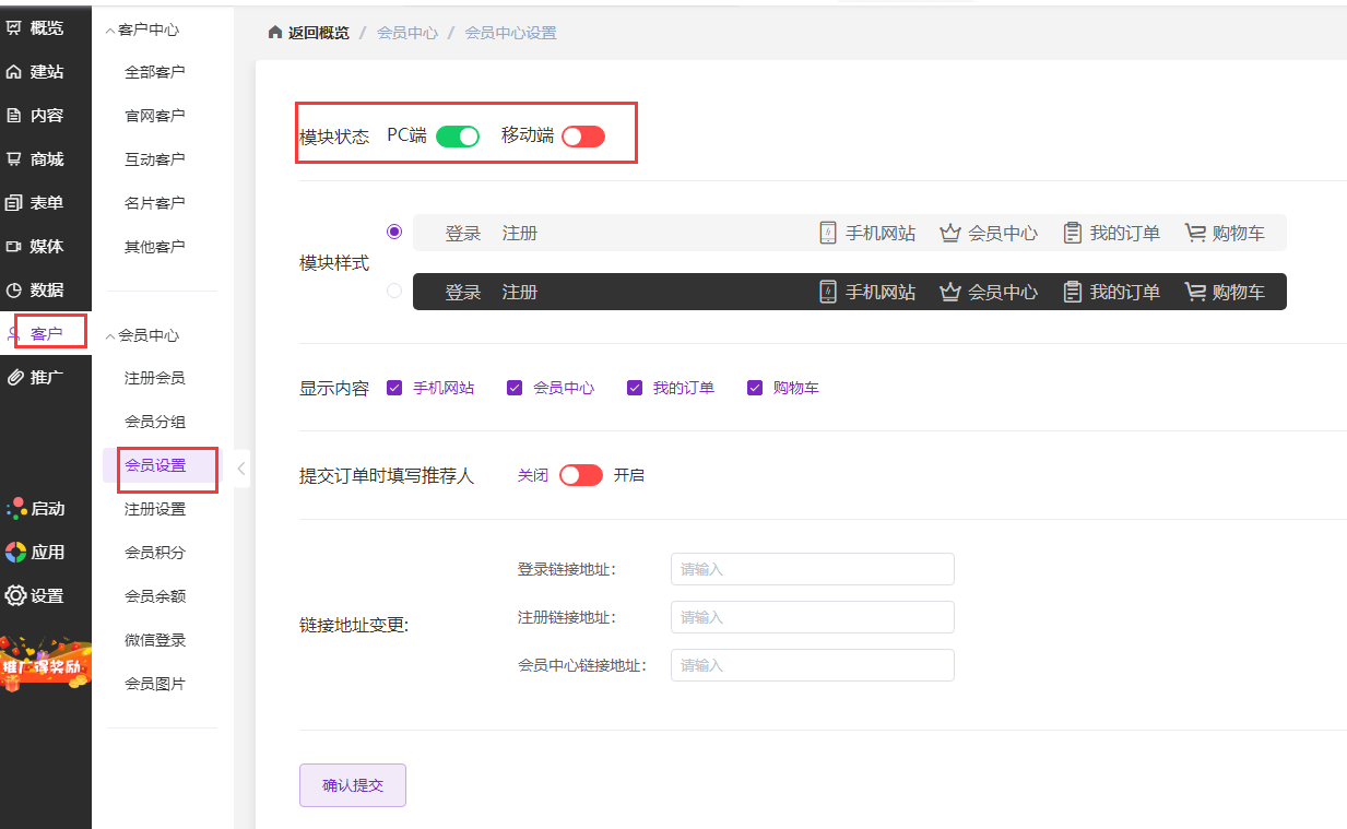 官微中心-客户-会员中心-会员设置,将模块状态处“PC端、移动端”两个开关关闭,然后点击下方“确认提交”。