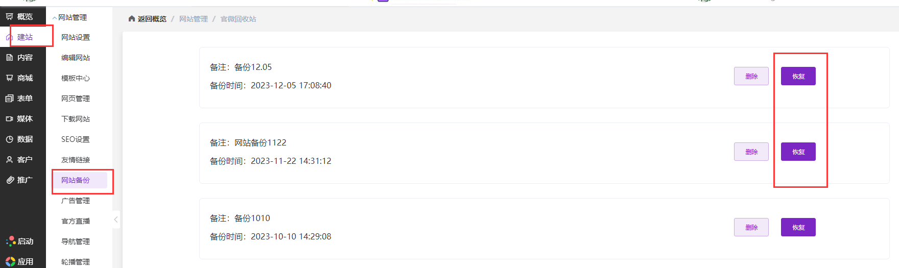 官微中心后台-建站-网站备份,在备份列表中找到最近的一次备份记录,点击“恢复”还原。