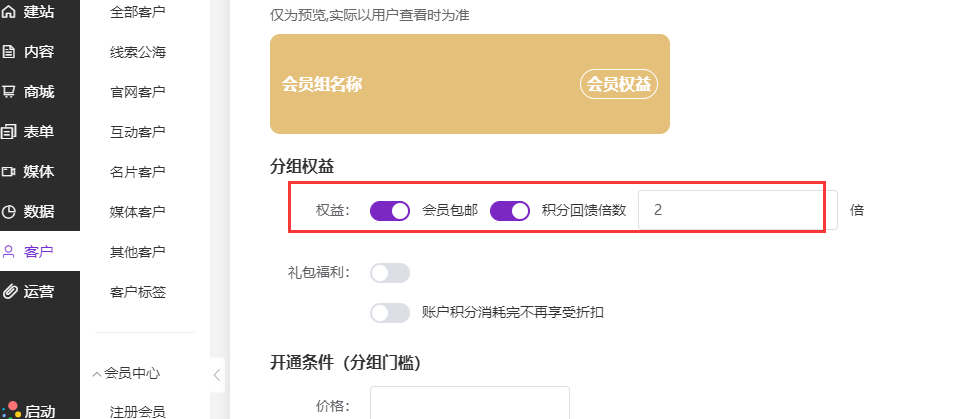 会员分组中的权益项设置后,对应分组中的会员会享有响应的权益。