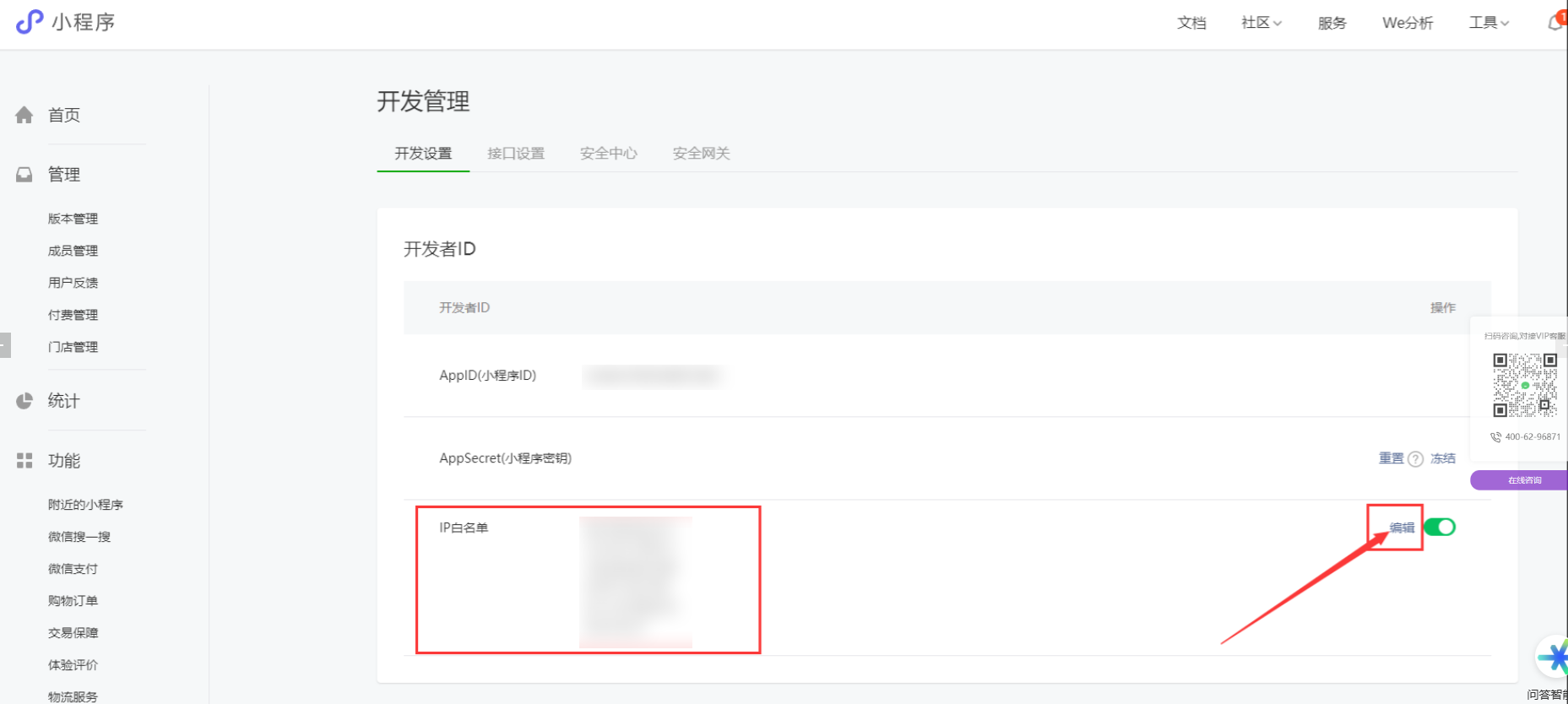 3、右侧找到“IP白名单”,点击【编辑】,管理员扫码确认