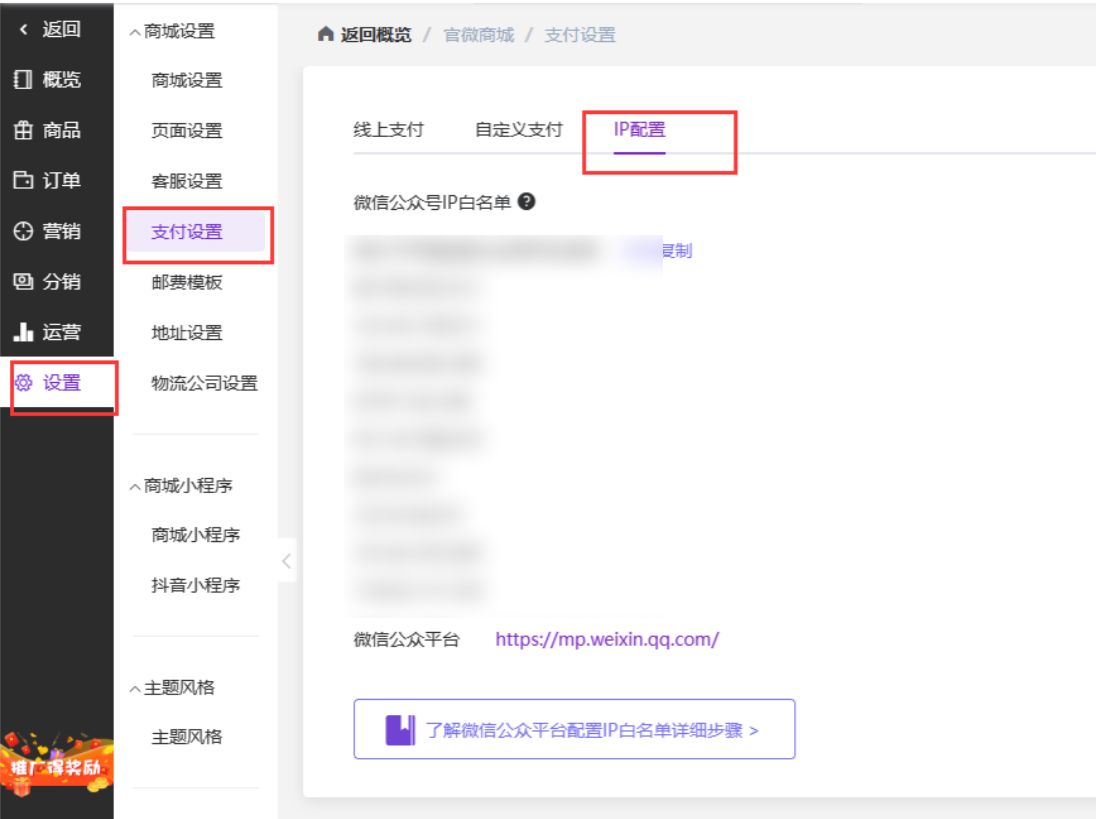 ps:白名单获取位置——【官微中心后台】——设置——支付设置——IP配置