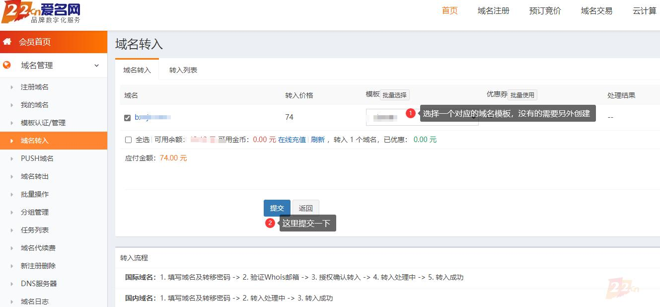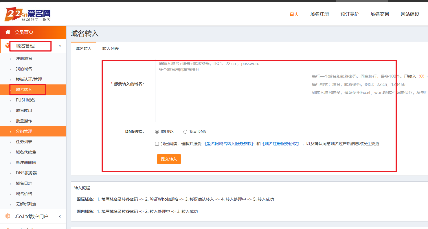 其他平台注册的域名如何转入到爱名网(22.cn)内?
