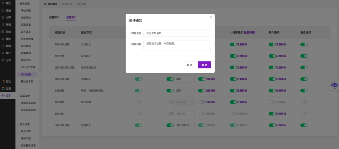 操作路径:官微中心 - 设置 - 通知提醒 - 提醒用户,找到 注册成功提醒 :