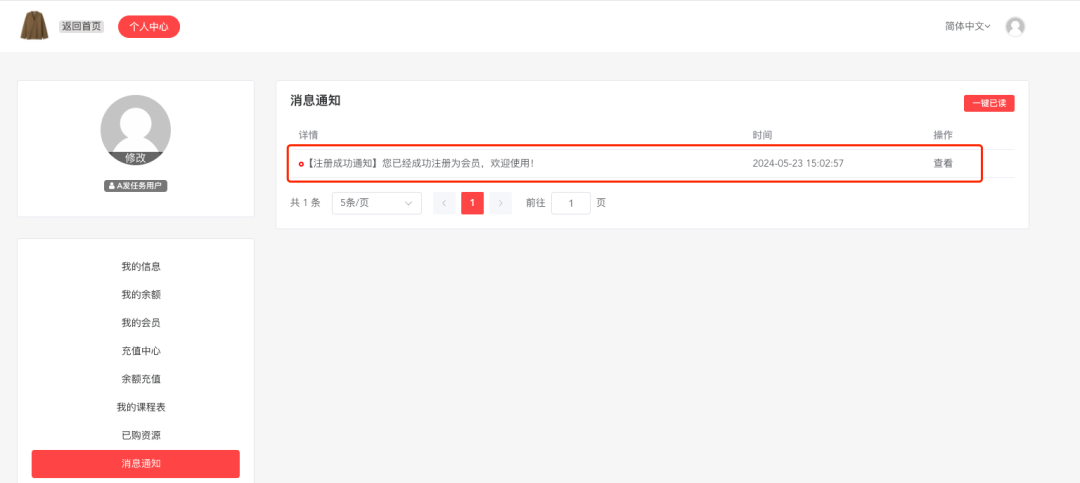 同样的,在会员中心的消息通知(站内信)栏目,也会收到一条提醒。如下图所示: