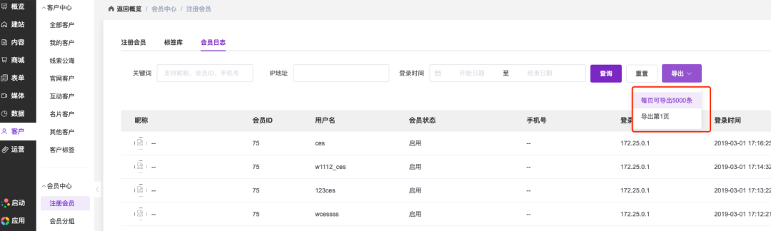 本次升级,我们新增了商城/网站注册会员的登录日志查看功能,支持搜索及导出。