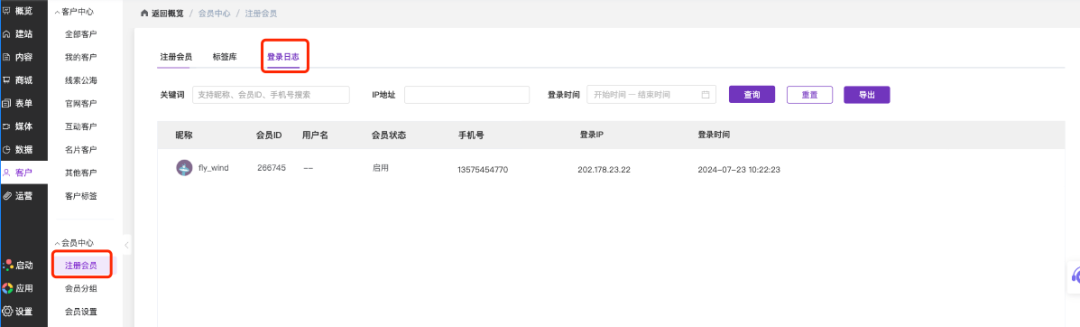 操作路径:官微中心 - 客户 - 会员中心 - 注册会员 - 登录日志