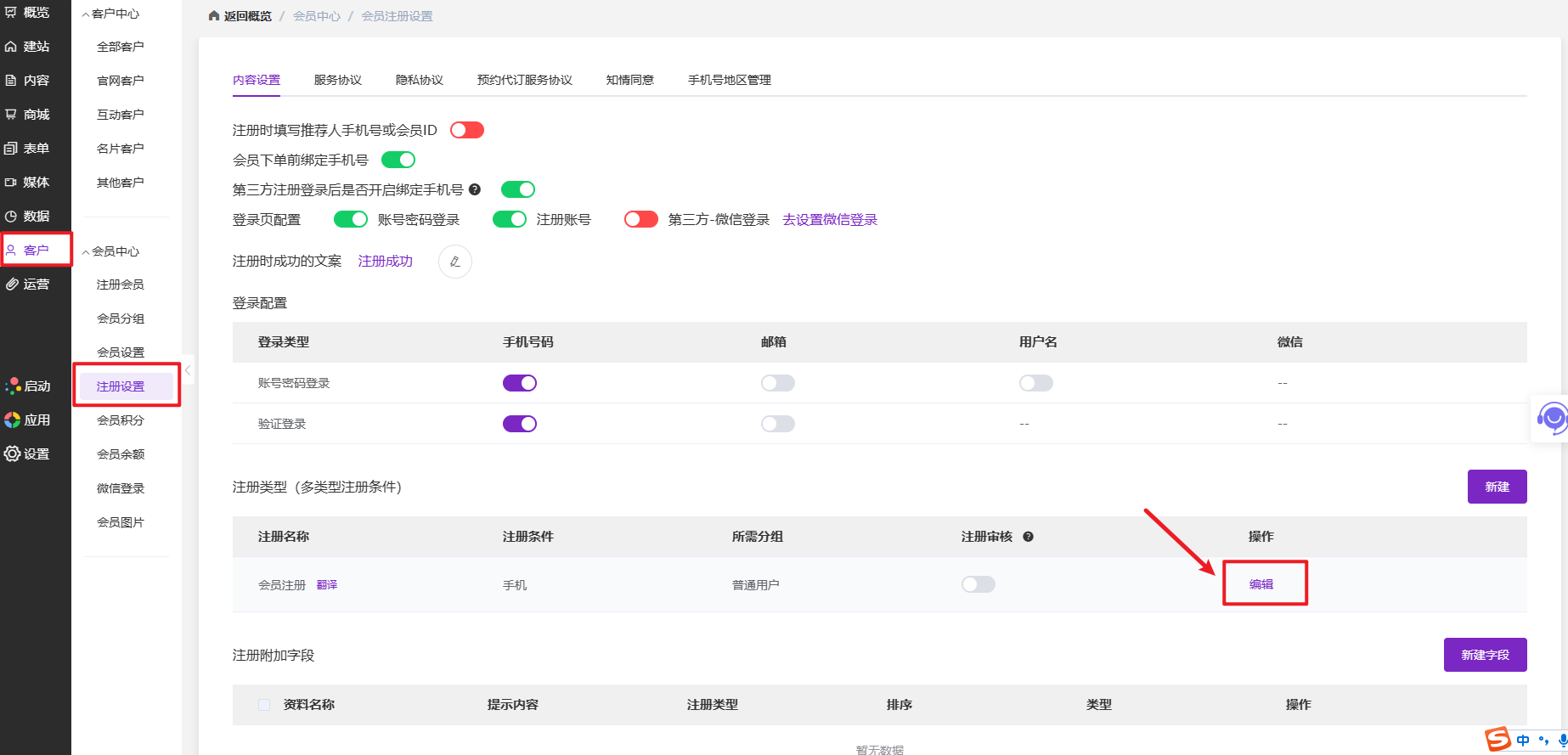 进入官微中心后台—【客户】—【注册设置】,找到【注册类型】—【编辑】,如下图所示: