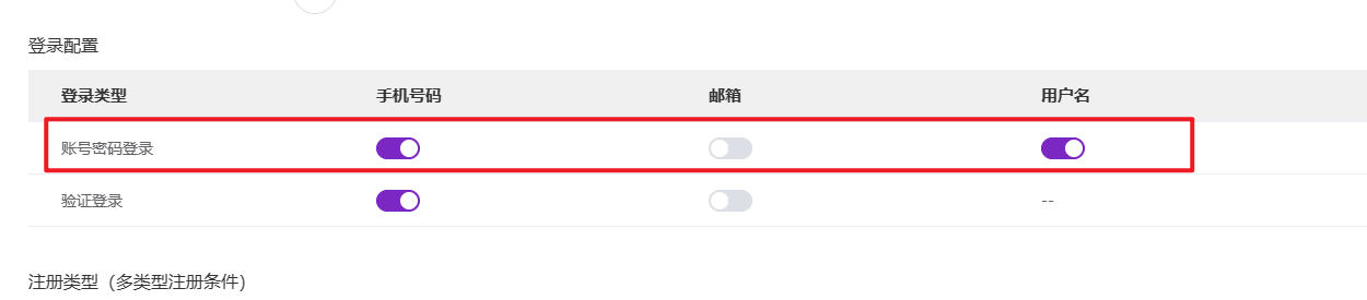 最后,在【登录配置】开启【账号密码登录】里【用户名】即可,如下图所示: