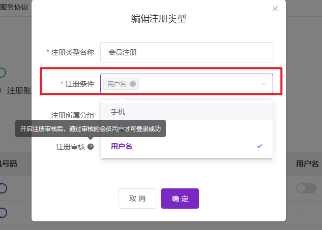 找到【注册条件】,选择上【用户名】即可,如下图所示: