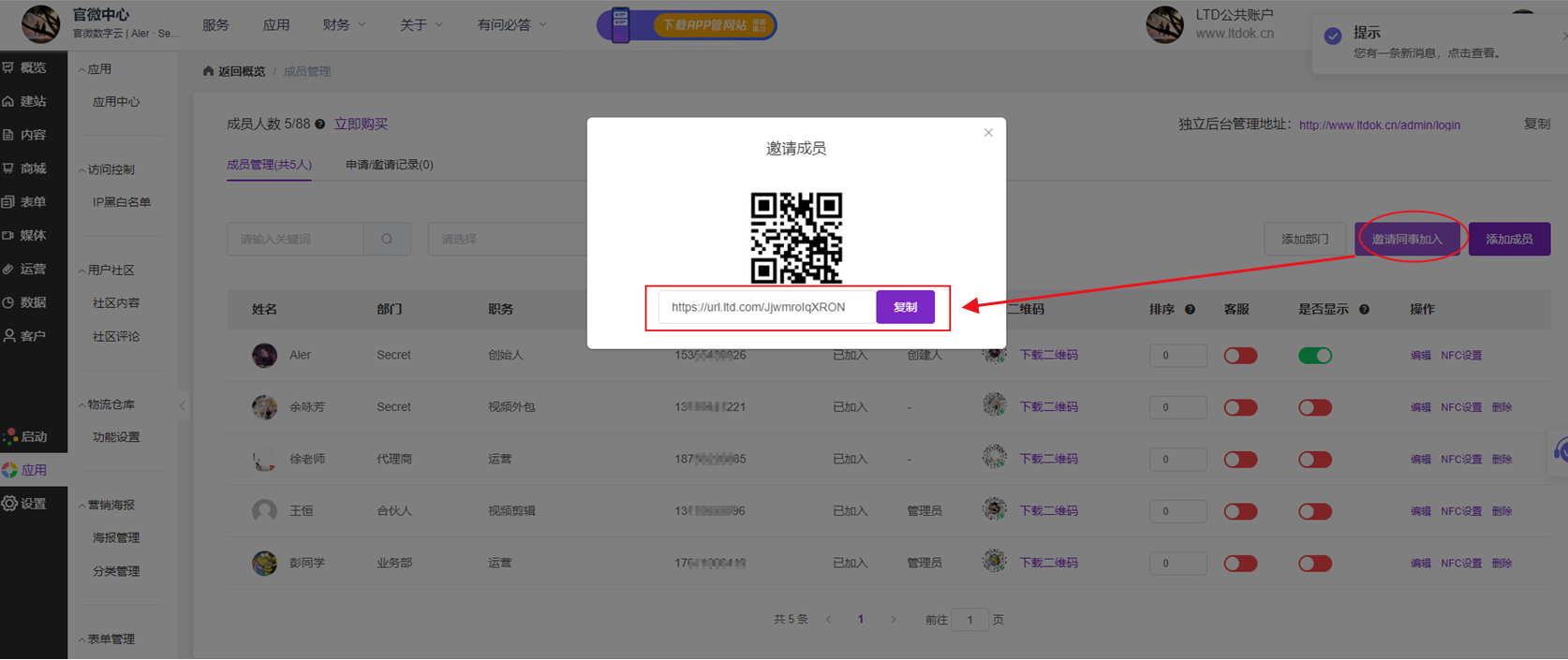 - 获取邀请链接或二维码:进入官微中心后台成员管理界面,点击 “邀请同事加入”,会弹出包含二维码和链接的窗口,可直接分享二维码,或点击 “复制” 获取链接发送给同事。