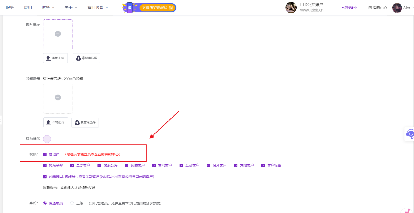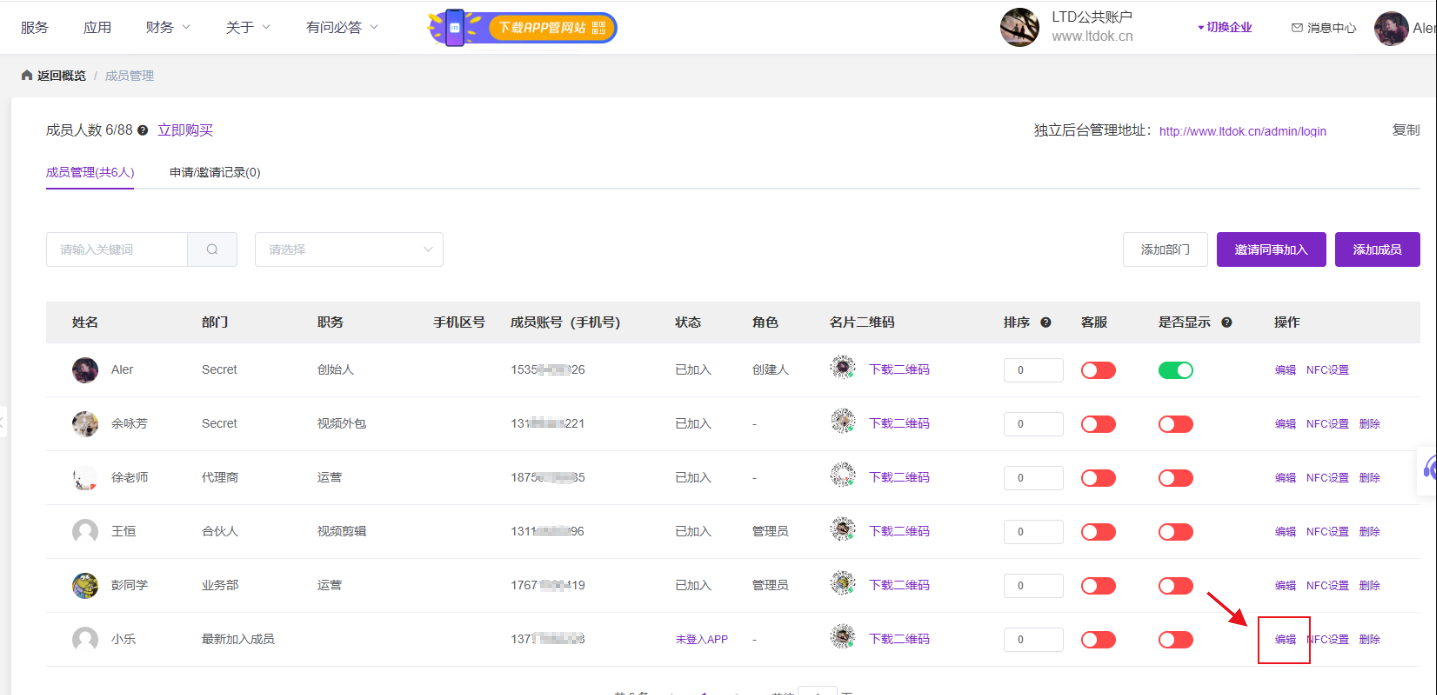 - 设置同事权限(企业端操作):在成员管理列表中找到新加入同事 “小乐”,点击 “编辑”,在权限设置处勾选 “管理员”(勾选后才能登录本企业的官微中心)等相关权限,按需配置其他权限后保存。