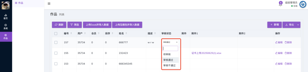 升级后,下拉字段(如 “审核状态:待审核 / 审核通过” )支持 行内编辑:点击列表中字段值,弹出下拉框直接选择新值(如图红框),秒级修改!