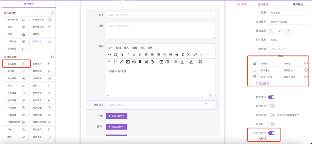 新增 / 编辑菜单时,添加 下拉选择字段(如 “审核状态” );