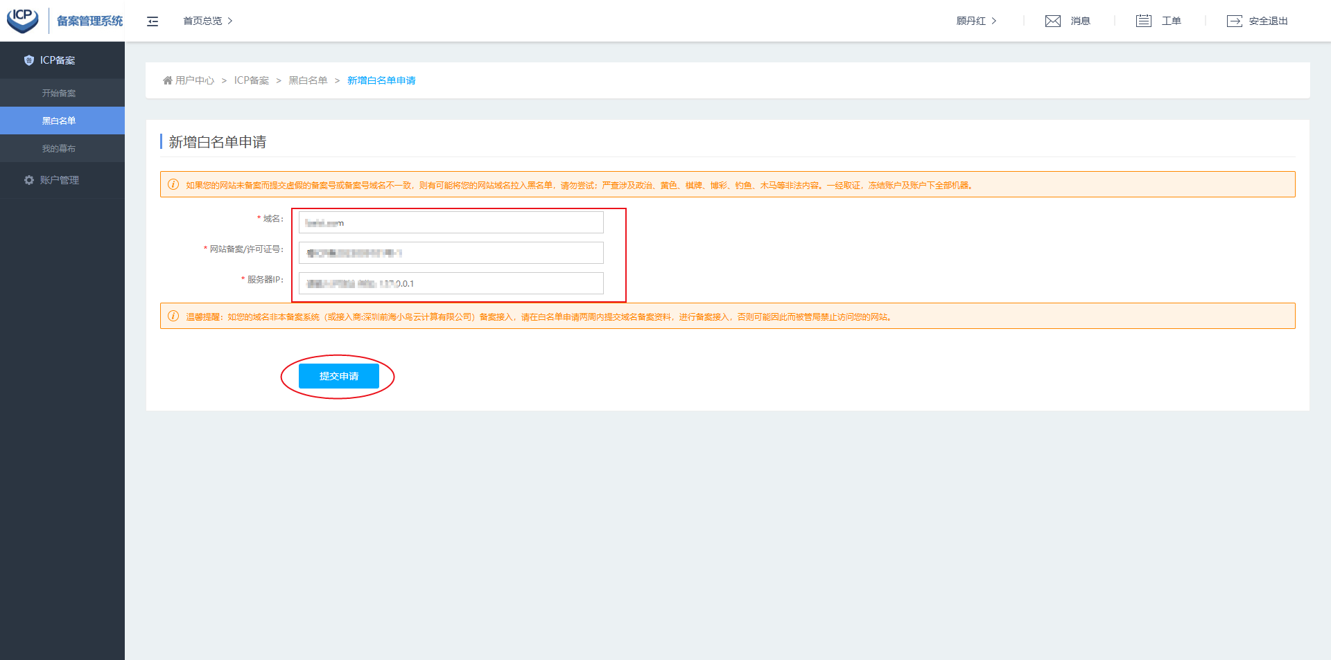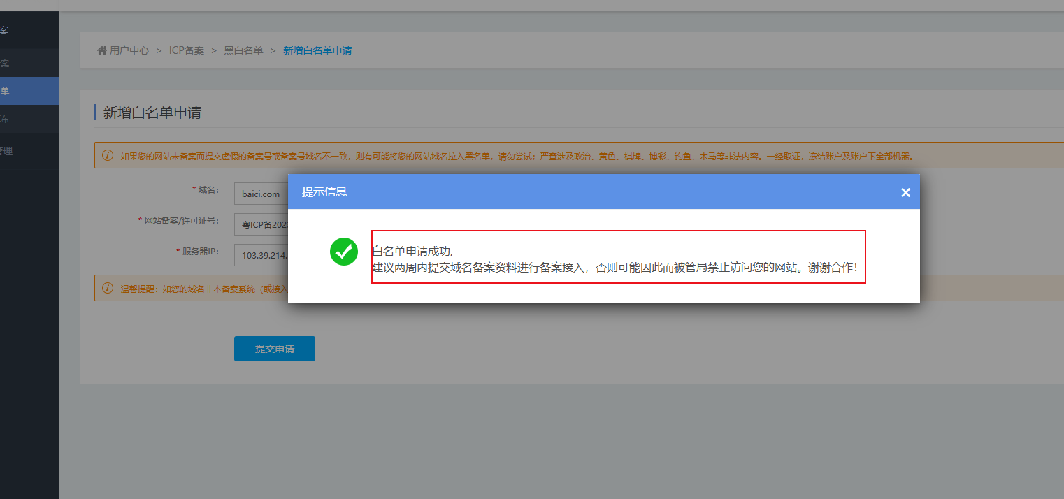 如果你的域名不是在当前小鸟云备案系统接入的,你需要做备案接入,否则白名单可能被撤销。