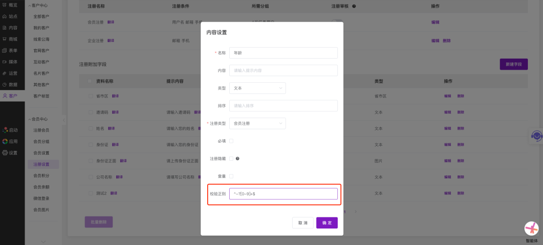 找到要设置的自定义字段(比如 “年龄” ),点 “编辑” ,弹出 “内容设置” 弹窗。