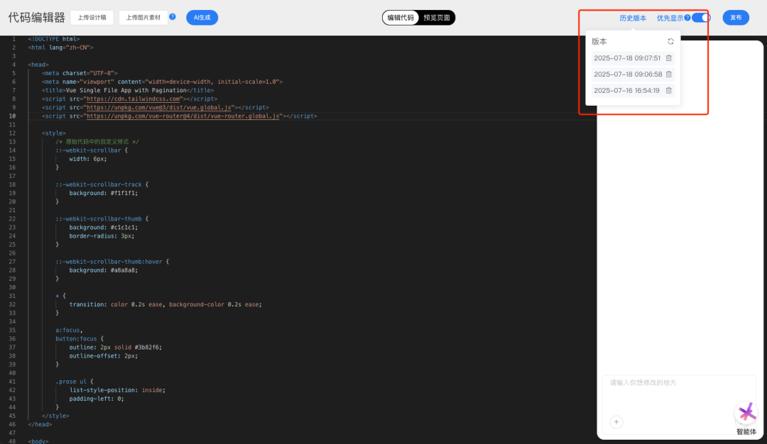每次点击发布按钮,系统会自动保存一份当前代码的历史版本。你可以通过编辑器右上角的 历史版本 按钮(如下图红框所示)查看所有保存记录。