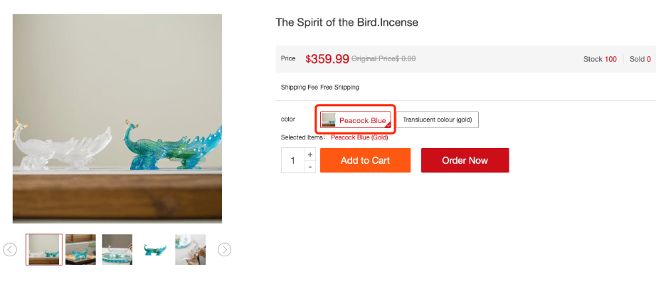 如下图所示,当选择其中一个商品规格,且该规格设置了主图时,左侧的商品大图将被切换为该规格的主图。