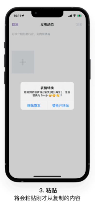 当用户使用如下图所示的流程,通过复制微信里的内容,粘贴到发动态页面内时,App将自动识别文字里所包含的微信表情文字,并提示是不是转换为emoji格式的表情。选择"替换",即可转换成功。emoji表情符号兼容性更好,并允许直接复制并粘贴到微信以外的其他平台。