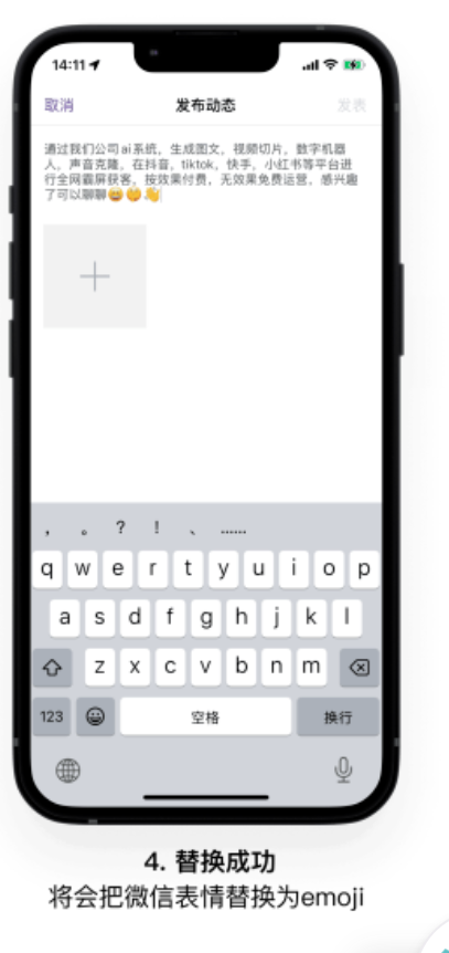下图为操作流程,替换成功并发布后,在企业动态或者动态广场中,也将显示为emoji表情。