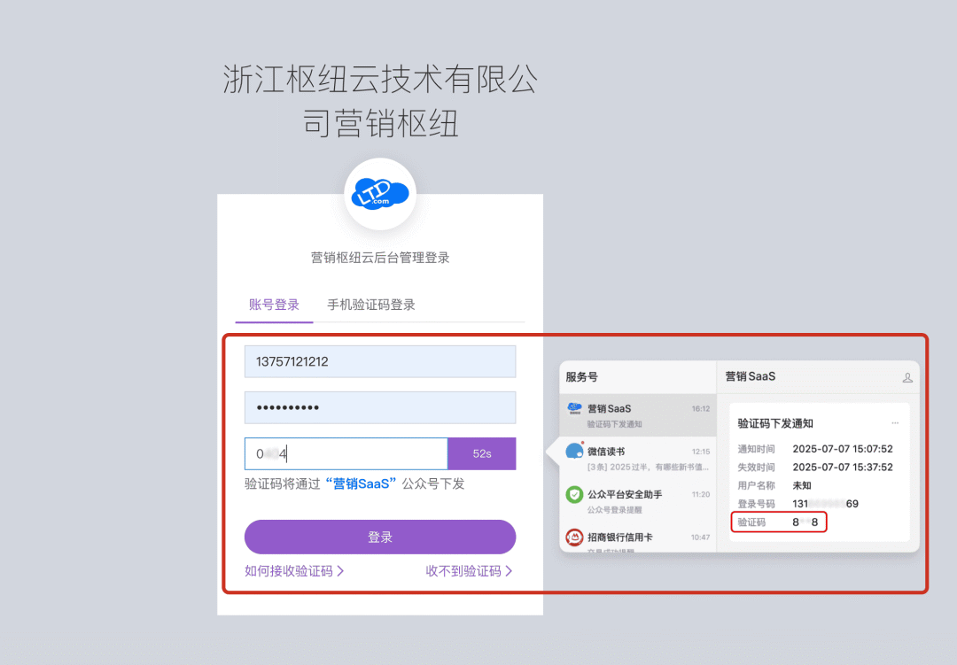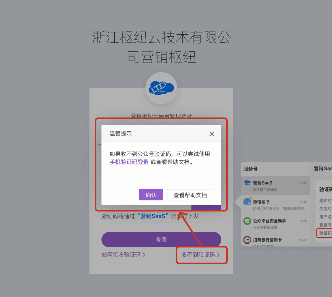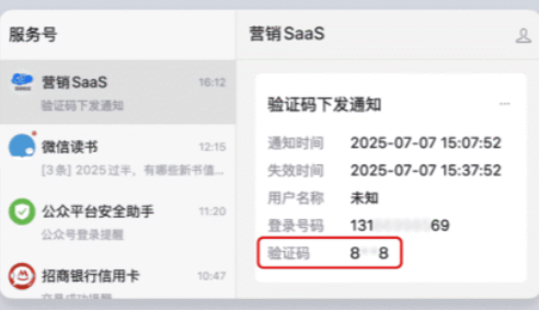 明确验证码下发公众号 ,验证码输入框下方会显示发送验证码的公众号名称,例如 “营销SaaS”,方便用户确认消息来源,页面新增验证码接收示例截图,帮助用户快速识别公众号消息中的验证码位置。