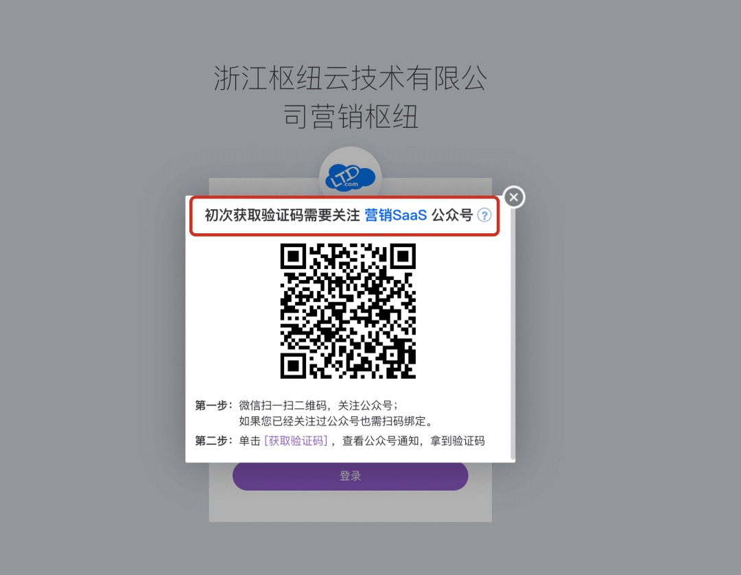 如果是第一次绑定接收验证码,需要先扫描页面提供的二维码,关注指定公众号(如“营销SaaS”),然后点击“获取验证码”并查看公众号通知。
