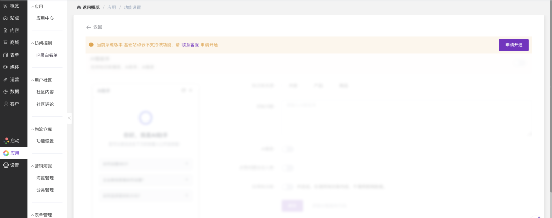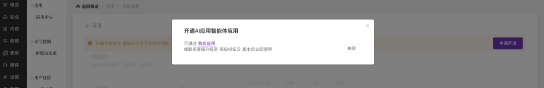 确认功能状态:当进入功能设置页面时,如果当前版本不支持知识库智能体,会显示提示信息:“当前系统版本基础枢纽云不支持该功能,请联系客服或申请开通”。