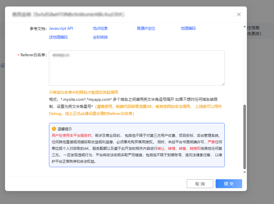 Referer白名单中加入自己的域名,只有该白名单中的网站才能成功发起调用,格式:*.mysite.com*,*myapp.com* 多个域名之间请用英文半角逗号隔开;如果不做限制,可以填写“*”即可。