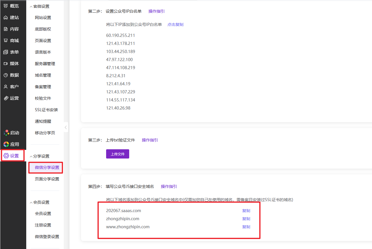 进入官微中心后台,找到【设置】—【分享设置】—【微信分享设置】,如下图所示: