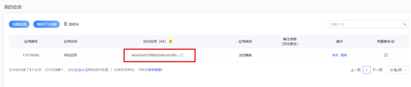 全部填写完成后,该应用信息会展示在【我的应用】页面,且分配独立的AK,及API KEY,复制该KEY,即可配置在自己的官网上。