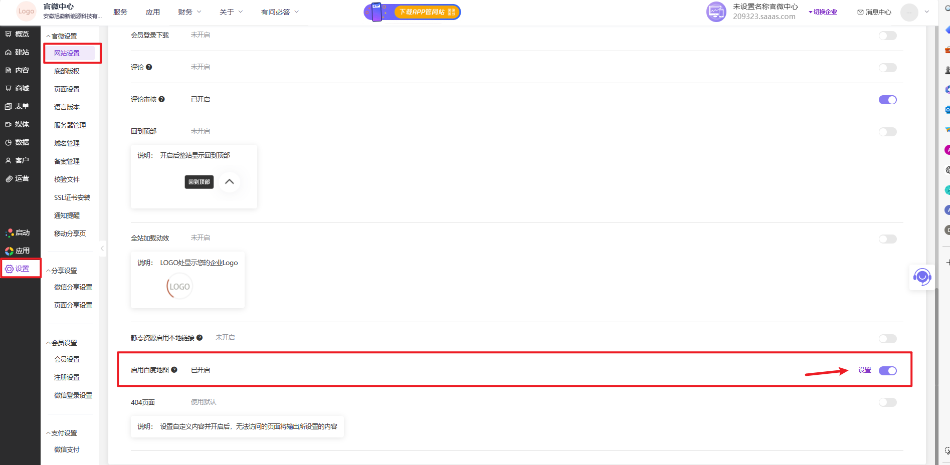 进入官微中心后台—【设置】—【网站设置】,点击【启用百度地图】,在【设置】处填写申请好的KEY,如下图所示: