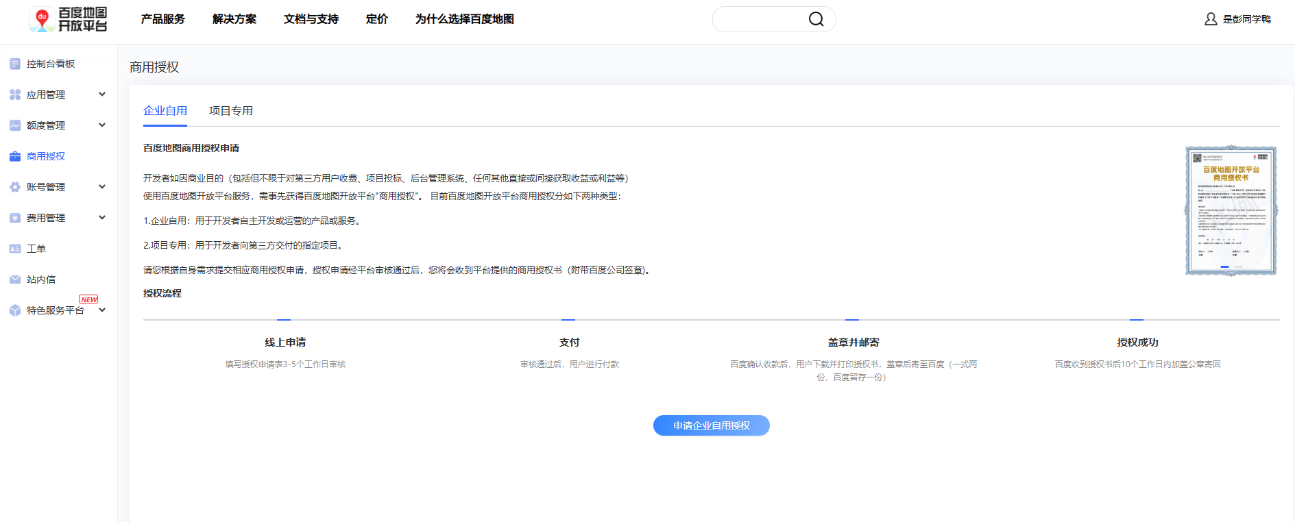 在【商用授权】页面即可申请,目前支持企业自用申请以及项目专用申请,可根据需求自行申请: