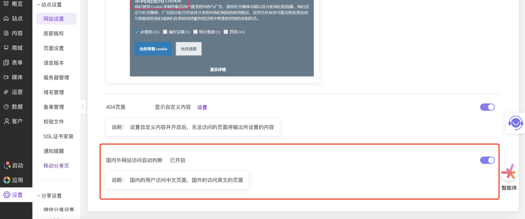 设置好本功能后,可以实现使用英语的访客,访问域名时打开的是英文版网站,使用中文的访客打开的是中文版网站的效果。操作路径:官微中心 - 设置 - 网站设置,找到下图红框中的国内外网站访问自动判断 功能,开启开关即可自动生效。