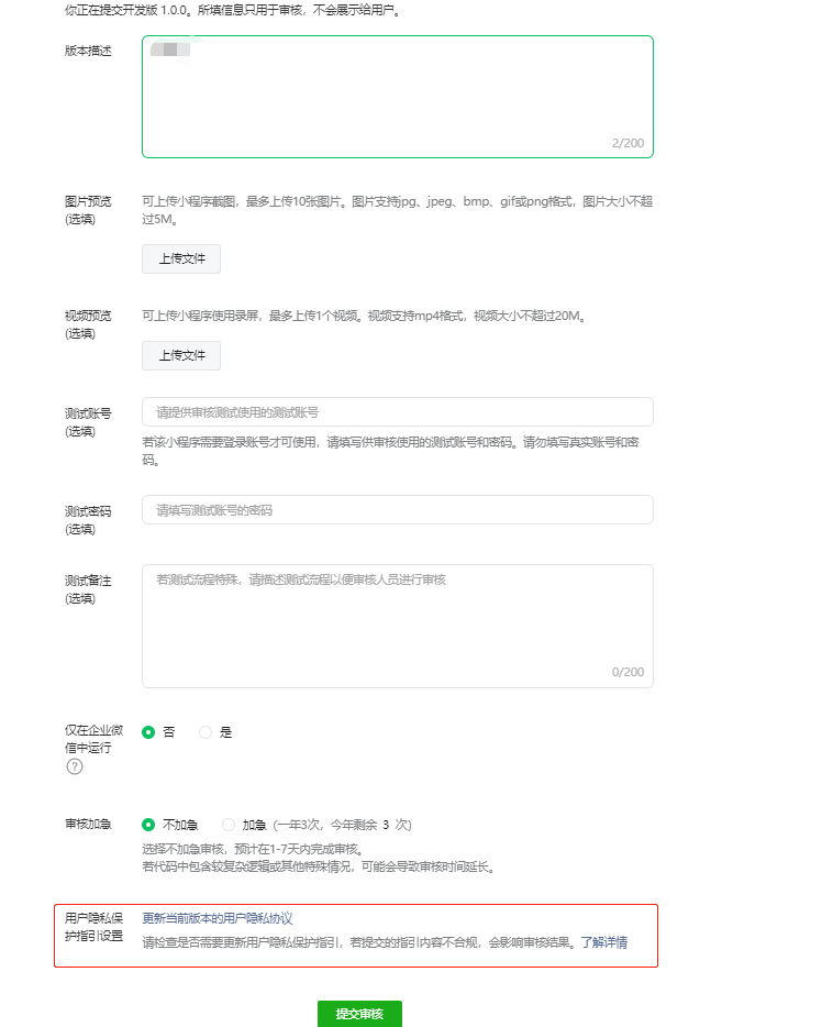 一、代码提审版本用户隐私保护指引填写入口:
